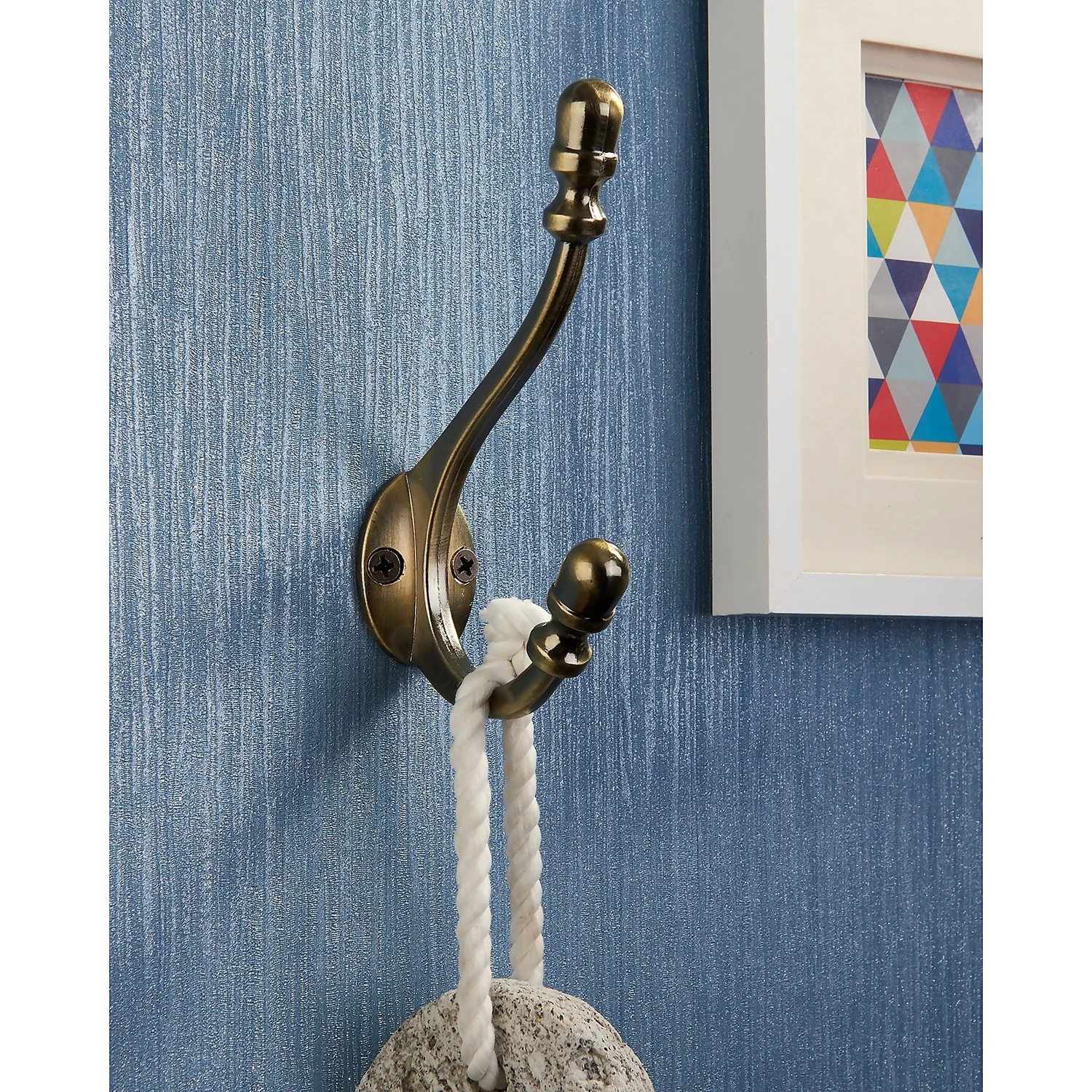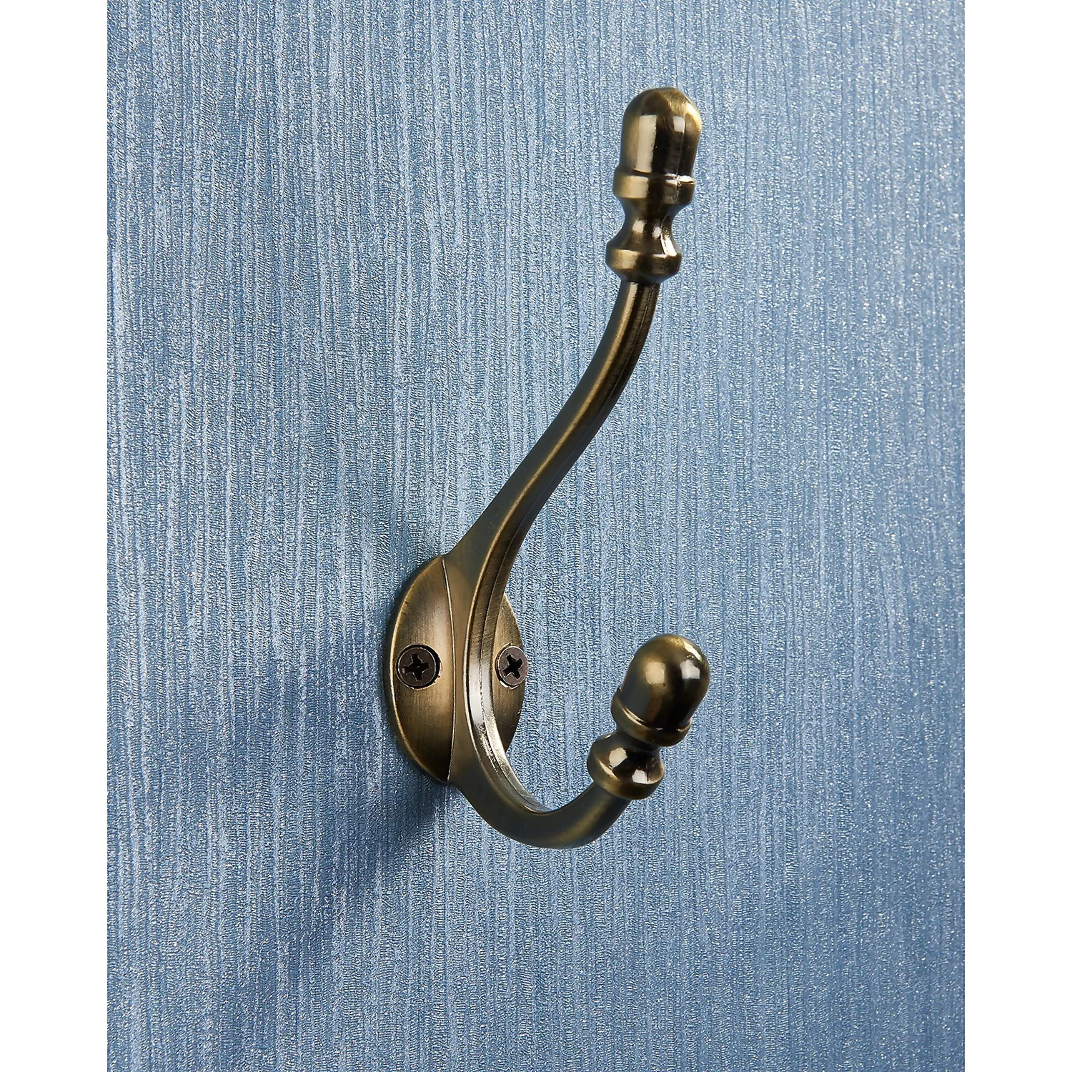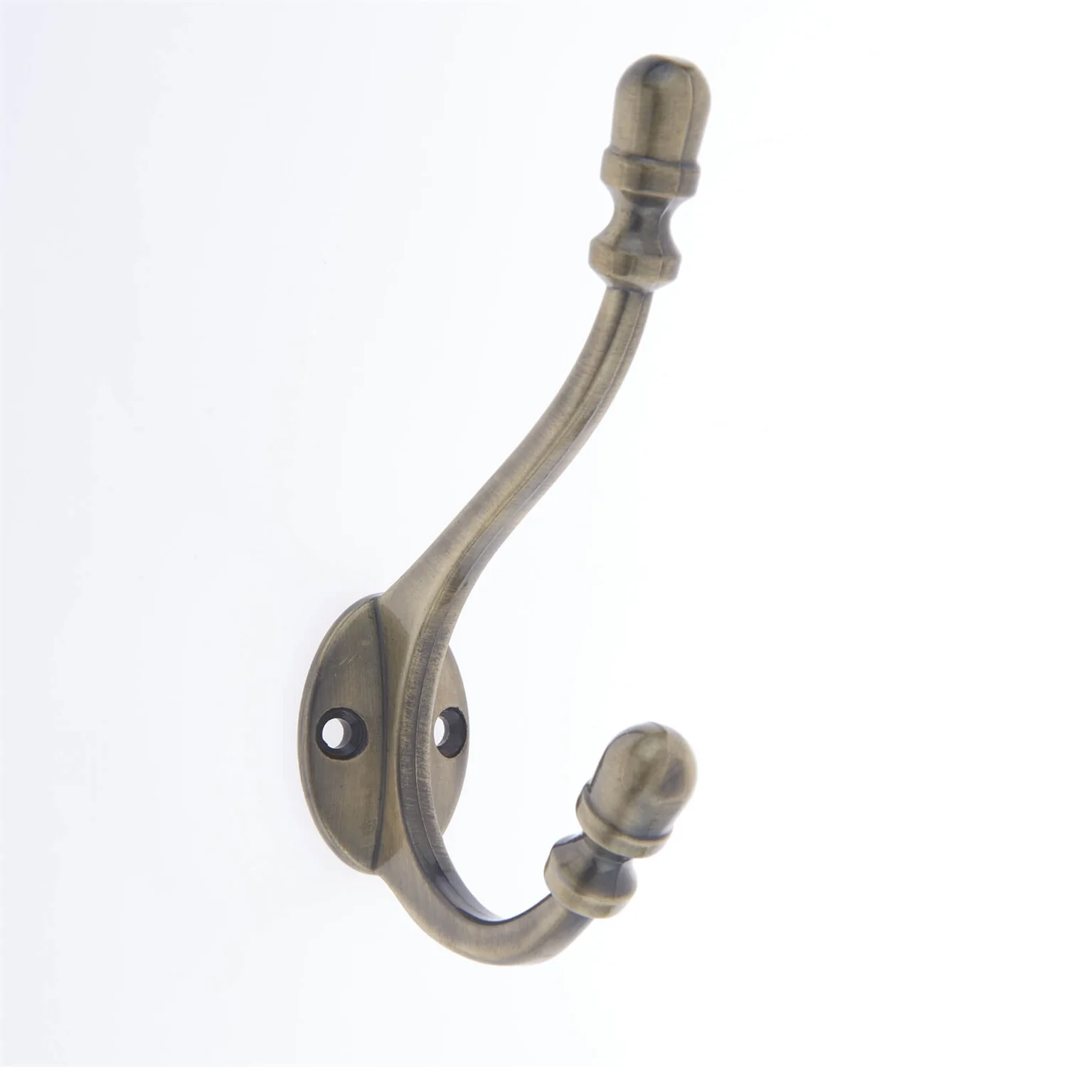 Antique style double hook in a fashionable antique brass finish.