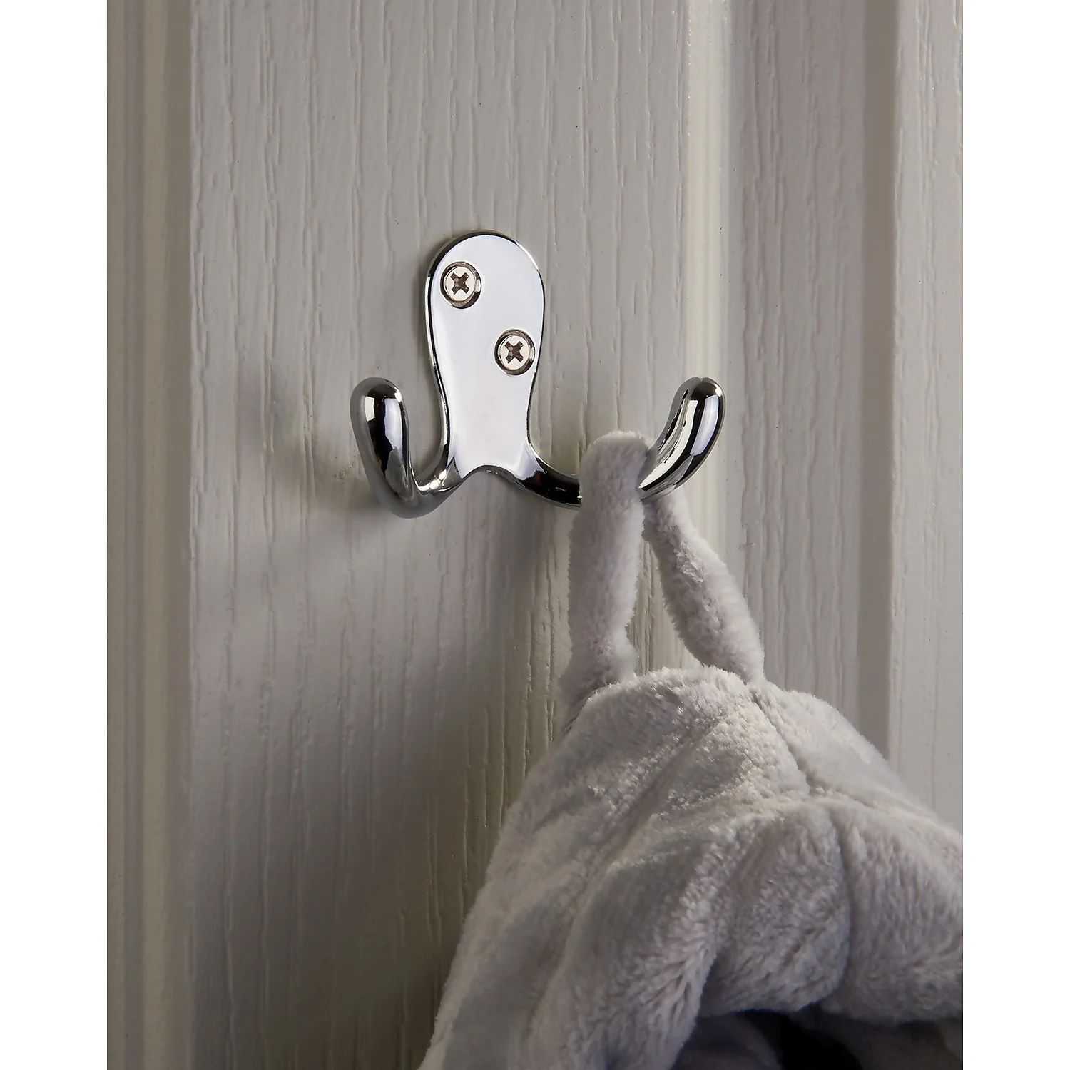 Classic double robe hook with a durable polished chrome finish.