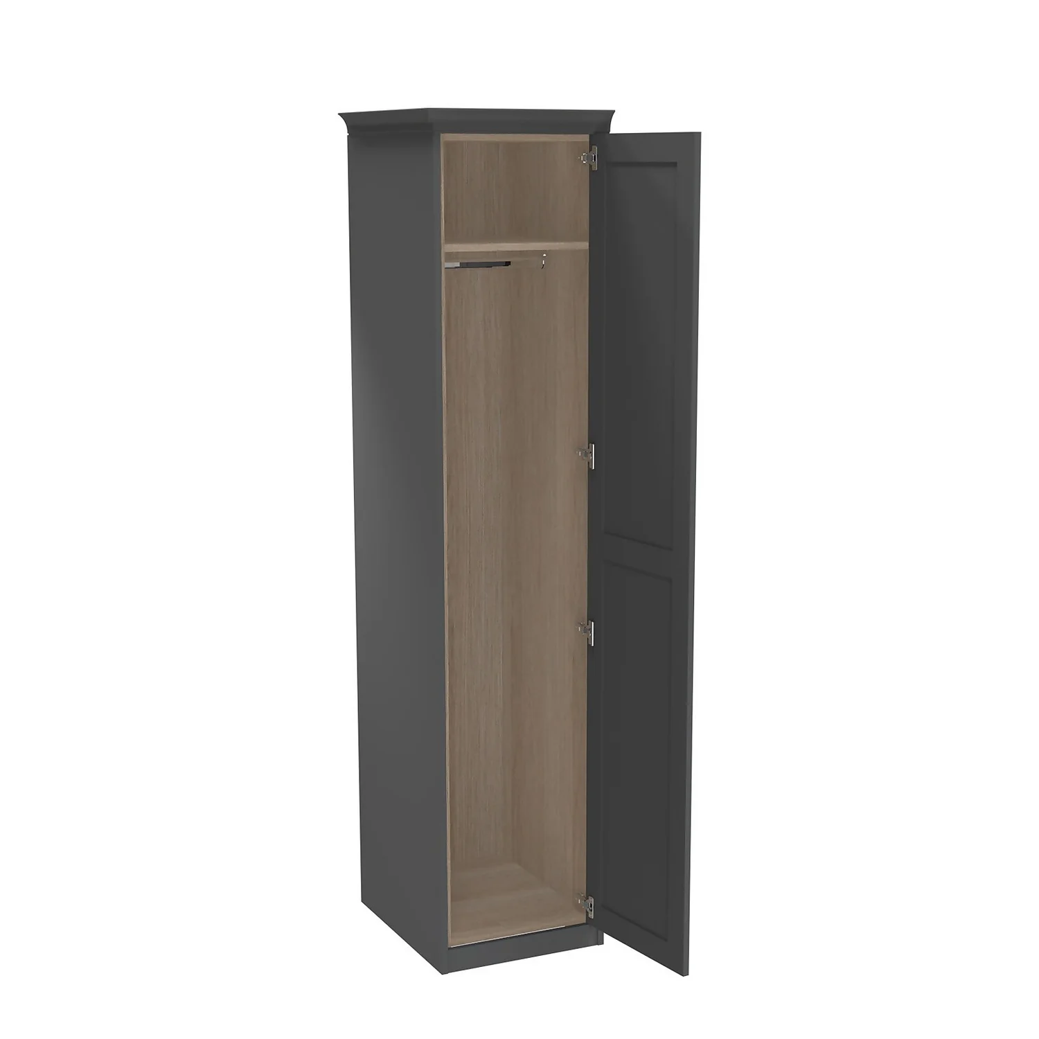 This single wardrobe features an oak effect internal carcass which includes end panels, plinth and matching cornice all in a finish to match the beautiful luxe matt carbon shaker door. The wardrobe features premium soft close Blum hinges, a shelf and a hanging rail. You can customise your wardrobe with our additional internal storage options (available separately) including internal drawers, shelves, dividing shelves and extra hanging rails. Choose your handles from our range of both traditional and modern to suit your desired look.