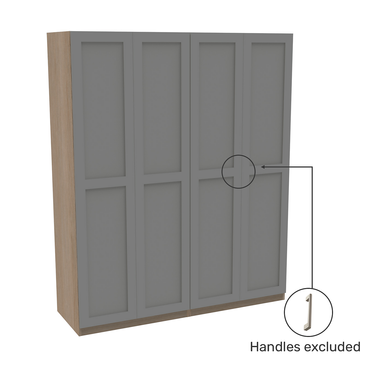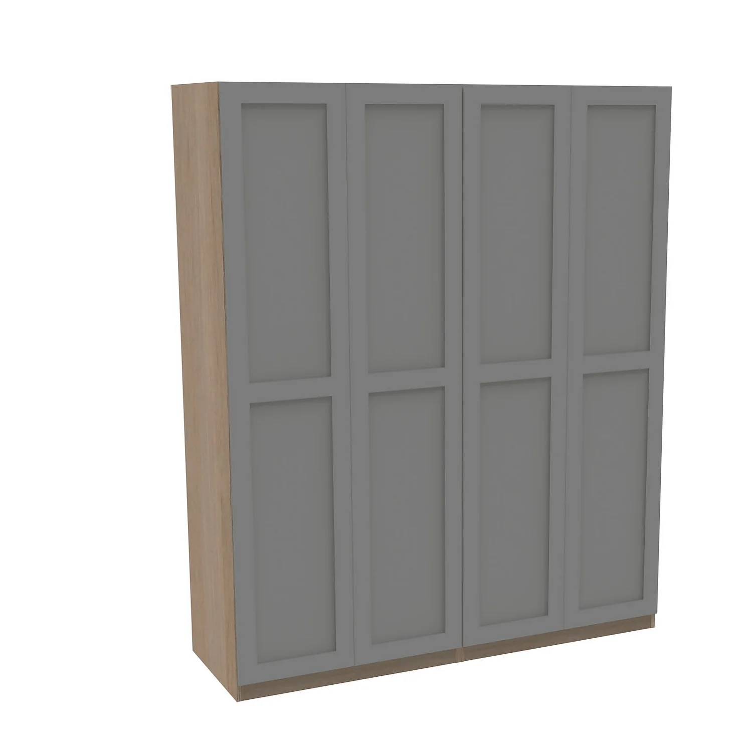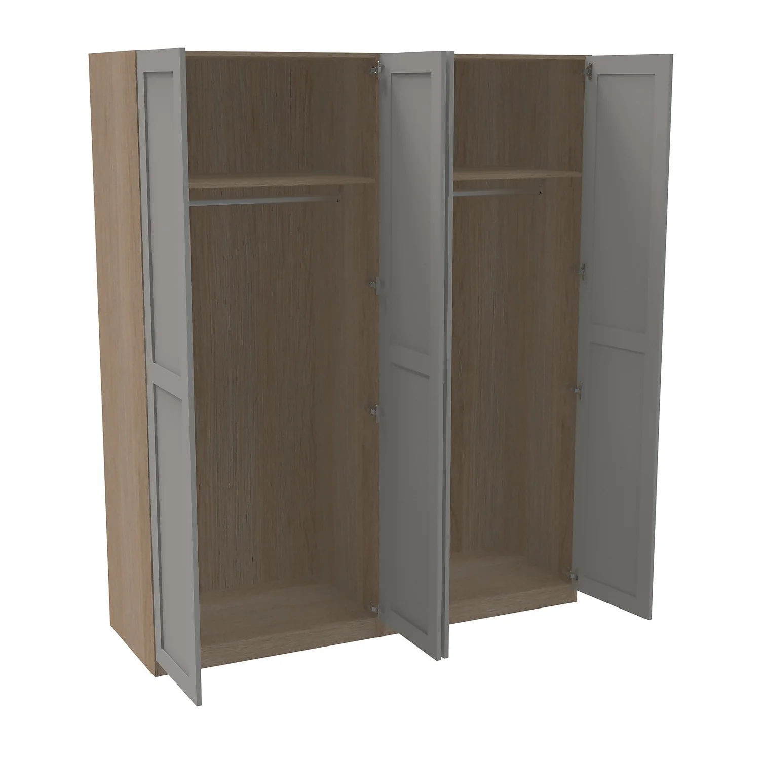 The House Beautiful range is exclusive to Homebase and offers a selection of different finishes and storage configurations to suit your needs. With a range of carcass colours and contrasting door designs, you can select the look to fit your bedroom aesthetic. This four door wardrobe (2 x double units) features an oak effect carcass and beautiful shaker doors finished in a luxurious matt grey. The wardrobe features premium soft close clip-on Blum hinges, two shelves and two hanging rails. You can customise your wardrobe with our additional internal storage options (available separately) including internal drawers, shelves, dividing shelves and extra hanging rails. Choose your handles from our range of both traditional and modern to suit your desired look.