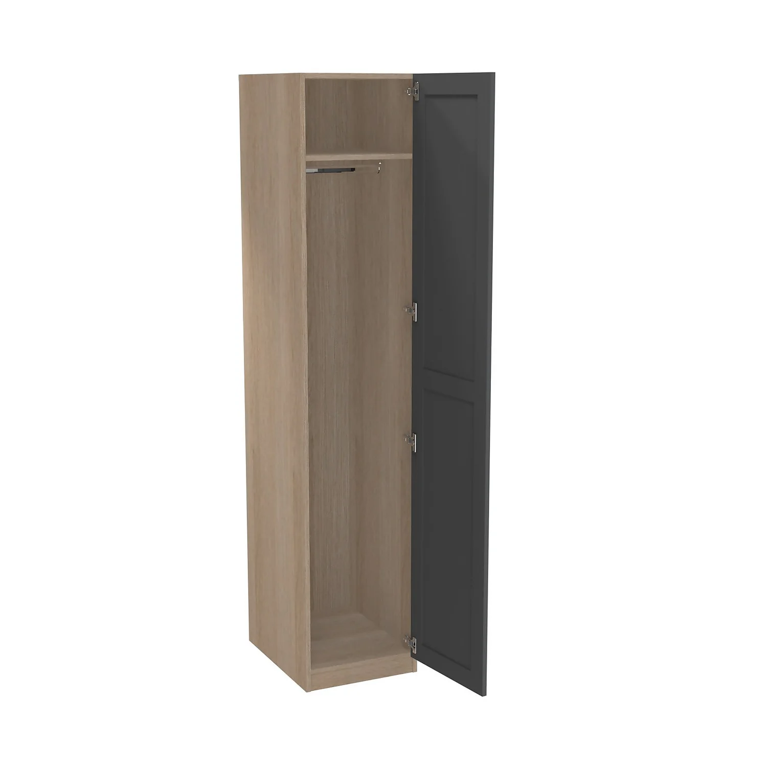 The House Beautiful range is exclusive to Homebase and offers a selection of different finishes and storage configurations to suit your needs. With a range of carcass colours and contrasting door designs, you can select the look to fit your bedroom aesthetic. This single wardrobe features an oak effect carcass and a beautiful shaker door finished in a luxurious matt carbon grey. The wardrobe features premium soft close Blum hinges, a shelf and a hanging rail. You can customise your wardrobe with our additional internal storage options (available separately) including internal drawers, shelves, dividing shelves and extra hanging rails. Choose your handles from our range of both traditional and modern to suit your desired look.