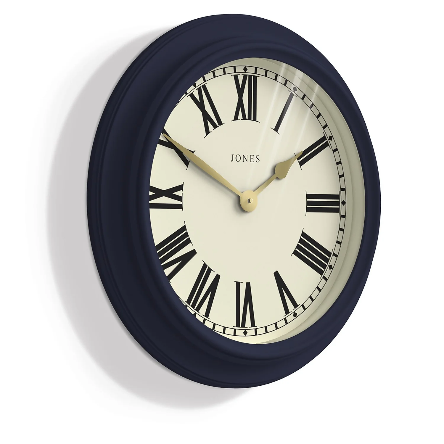 - A large decorative wall clock with a classically moulded case, elegant numerals and traditional metal hands that measure time behind a flat glass lens. Finished in Navy Blue